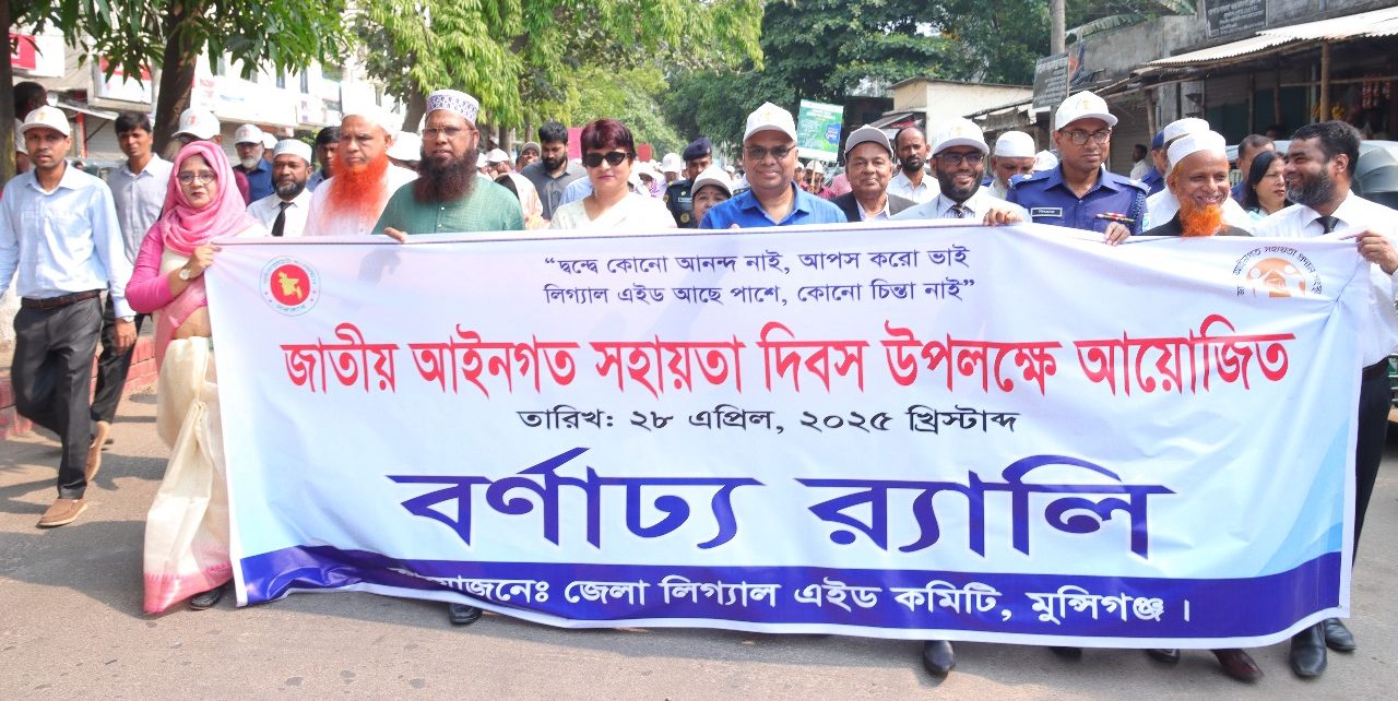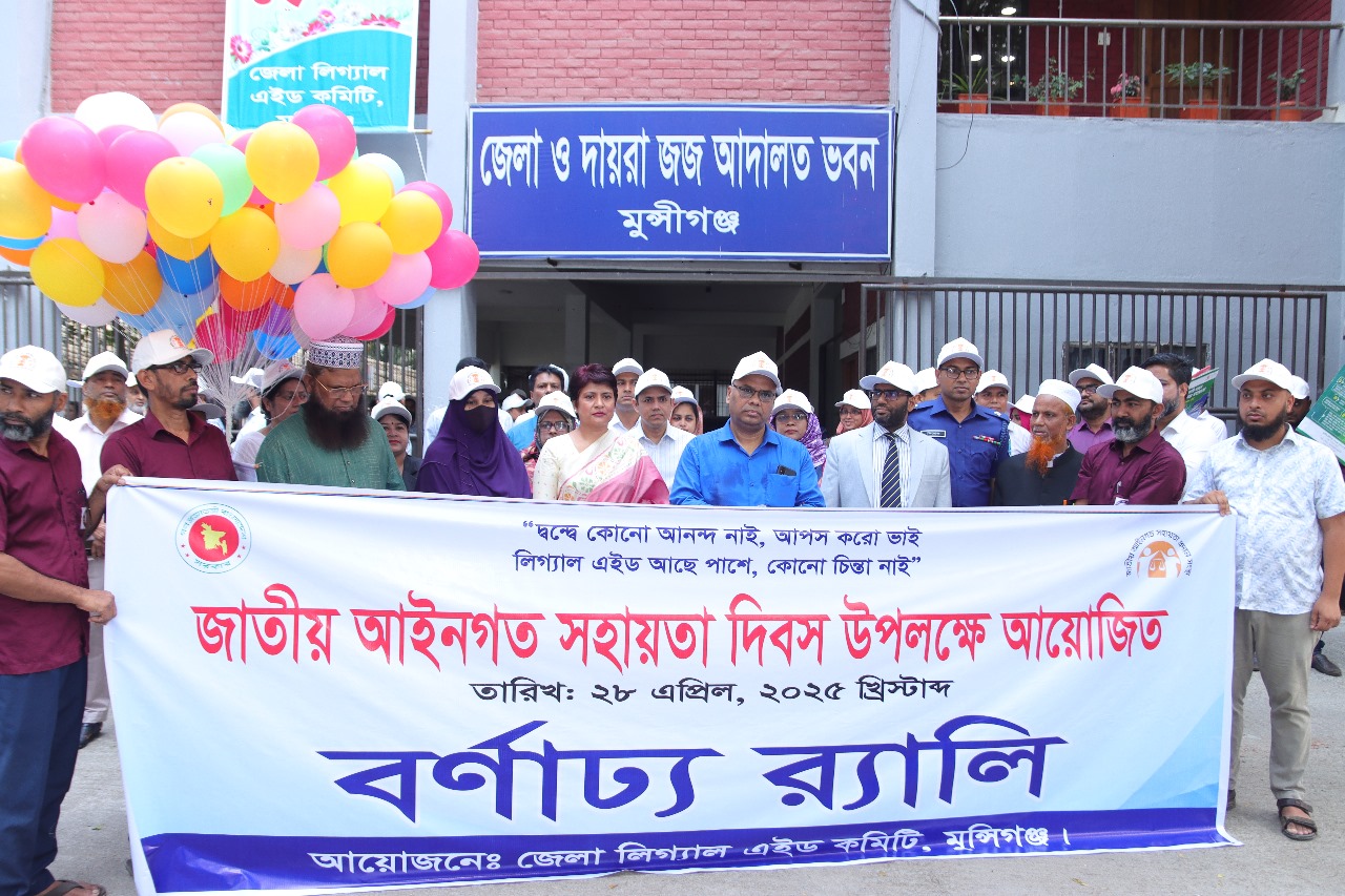 “দ্বন্দে কোন আনন্দ নাই, আপস করো ভাই, লিগ্যাল এইড আছে পাশে, কোন চিন্তা নাই” এই প্রতিপাদ্যে মুন্সিগঞ্জে জাতীয় আইনগত সহায়তা দিবস পালিত হয়েছে। সোমবার (২৮ এপ্রিল) সকাল ৯ টায় দিবসটি উপলক্ষে জেলা ও দায়রা জজ আদালত চত্বর থেকে এক বিশাল র‌্যালি বের হয়।