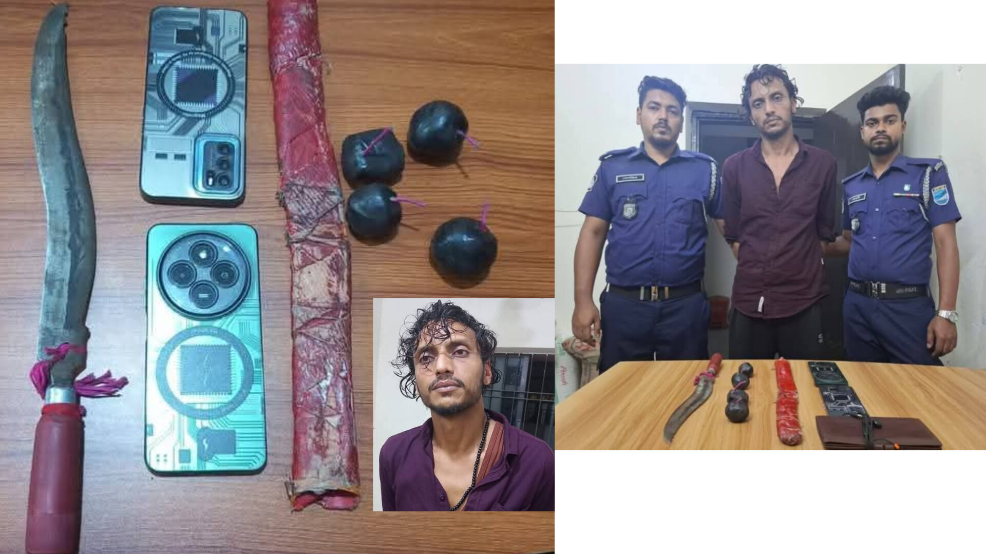 এ সময় অভিযুক্ত ব্যক্তির কাছে তল্লাশি চালিয়ে একটি ধারালো অস্ত্র সহ ৪টি হাতবোমা উদ্ধার করা হয়।